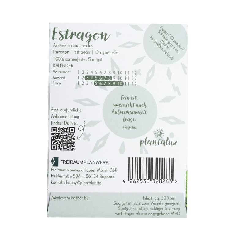 Die zarten, schmalen Blätter der Pflanze verströmen einen eleganten Duft, der an Fenchel, Anis und Sommer erinnert. Estragon ist mehrjährig, winterhart und anspruchslos – ein Kräuterliebling für Beet, Balkon und Hochbeet.